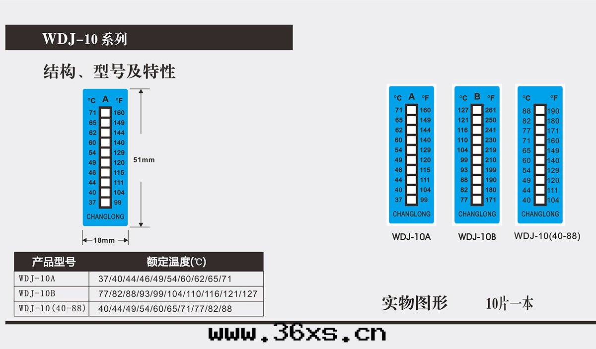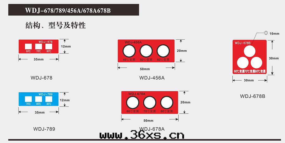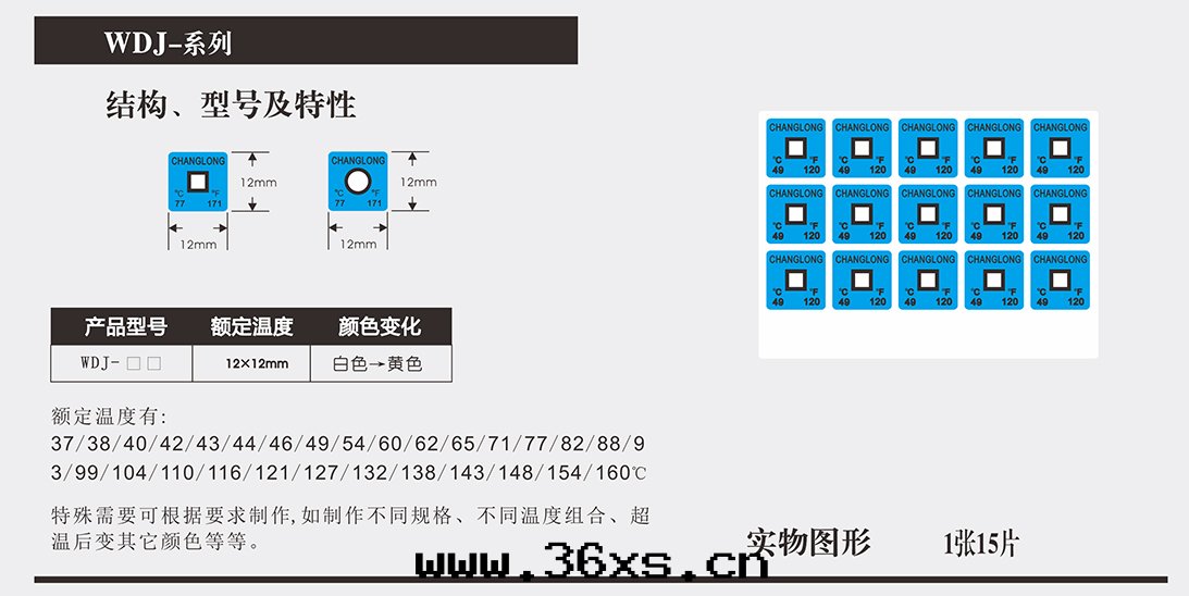 WDJ系(xì)列測温(wēn)紙(zhǐ),粘合性(xìng)強(qiáng),粘贴方(fāng)便,超温(wēn)變(biàn)色(sè)後(hòu)顔色(sè)不(bù)可逆,具有記(jì)录(lù)功能(néng)。參照中(zhōng)國(guó)铁(tiě)路(lù)總(zǒng)公(gōng)司TJ/CL442-2015《铁(tiě)路(lù)客車電(diàn)線(xiàn)電(diàn)缆(lǎn)用(yòng)感(gǎn)温(wēn)贴暫行技術(shù)条(tiáo)件(jiàn)》标(biāo)準生(shēng)产,並(bìng)通(tòng)过(guò)國(guó)家(jiā)權威機(jī)構的(de)品質(zhì)檢測。